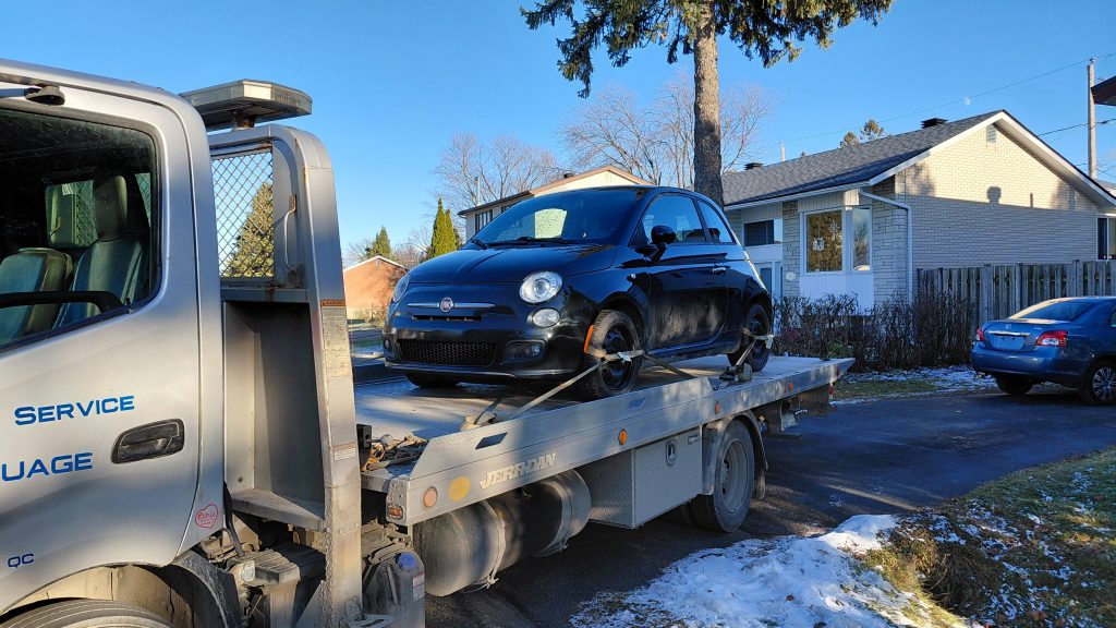 As you may recall from my previous post, my beloved little Fiat 500 (above right) had a problem with a drive shaft that turned into an almost two week ordeal trying to find a replacement part. Since I needed a car to get to work, time was of the essence and in the end I had to get rid of a whole car because I couldn’t find a part in time. To say I was disappointed is an understatement. I ended up finding a good deal on a gently used Toyota Yaris four door Sedan. It’s certainly not sexy or cute like the little Fiat was, doesn’t turn heads or make children smile, but it will be dependable transportation, hey it’s a Toyota! I’ve had many Toyota Echos grace my driveway over the years, so I know these cars very well. As you can see above, the little Fiat, which I had named Kira, ended up on a flat bed truck as I gave her to a charity who will fix her eventually and auction her off to the highest bidder, with the proceeds going to the Montreal SPCA to help little kitties and doggies. Good luck little Kira, hopefully you’ll go on to some great adventures.
